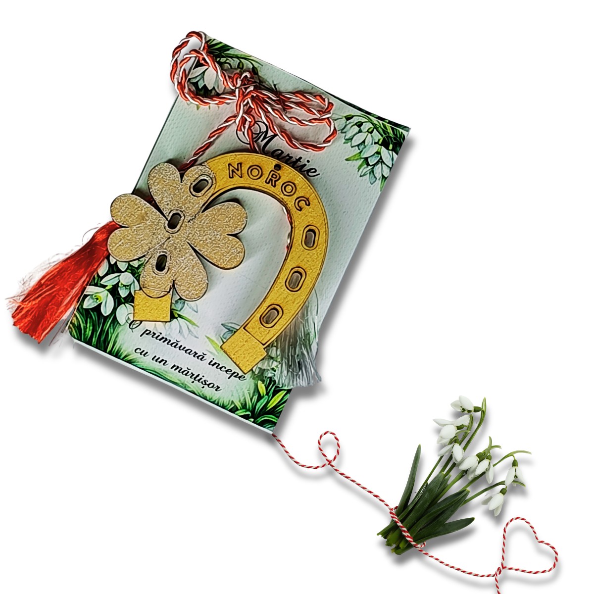 Martisor decorativ din lemn- auriu- ”Noroc la purtator”