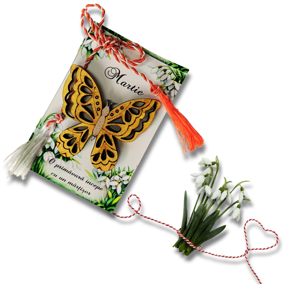 Mărțișor elegant realizat din lemn, pictat manual în nuanțe aurii, ideal pentru a fi oferit cadou de 1 Martie sau ca mic obiect decorativ de primăvară.