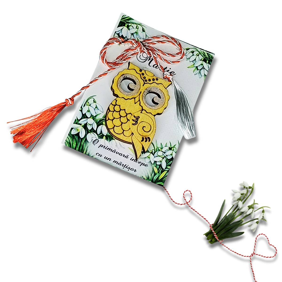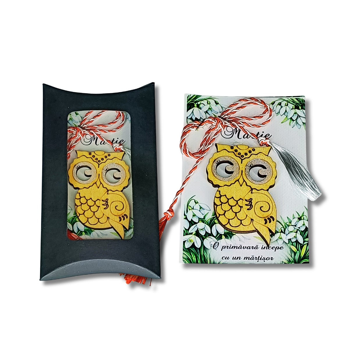 Martisor decorativ din lemn – auriu ”Bufnita Norocoasa”