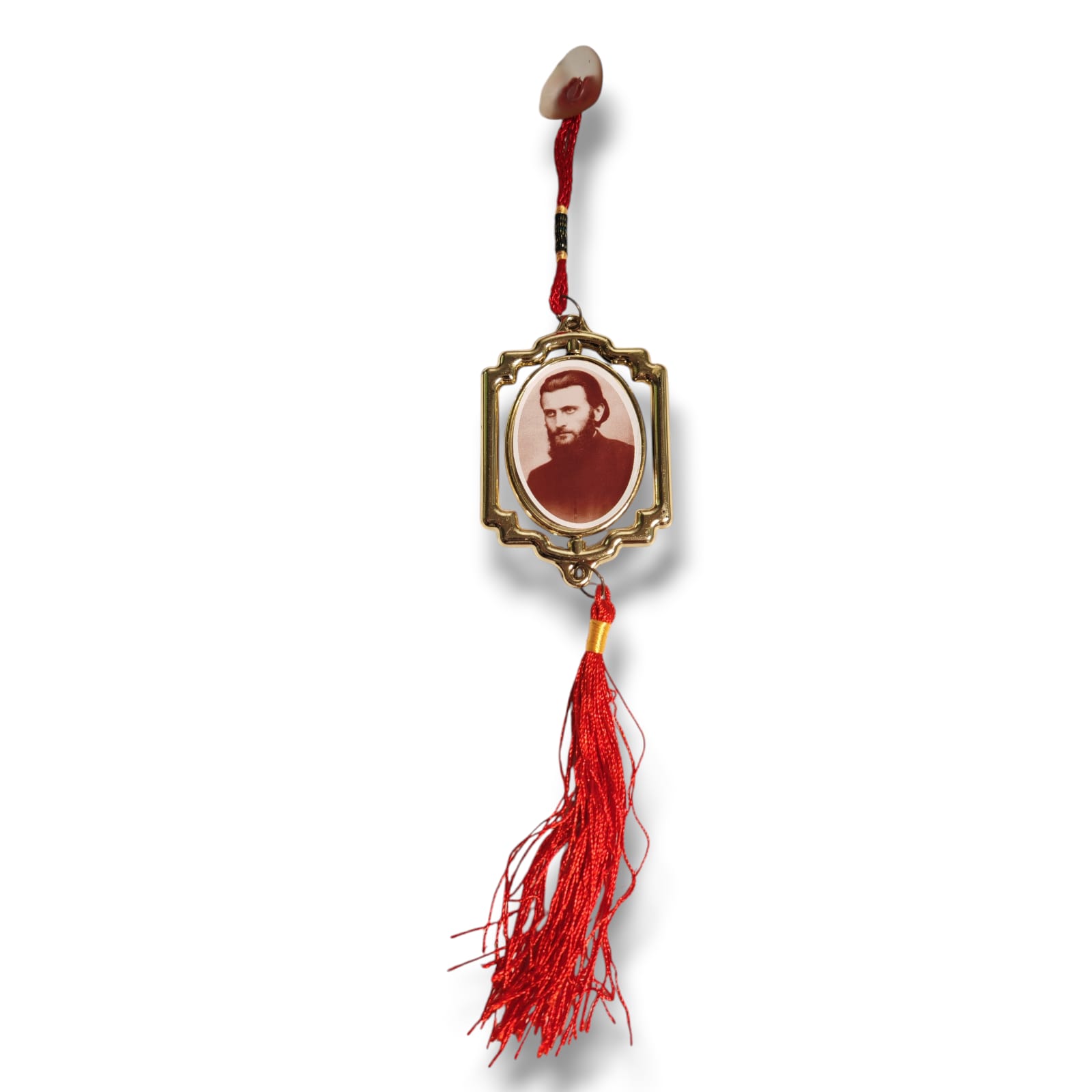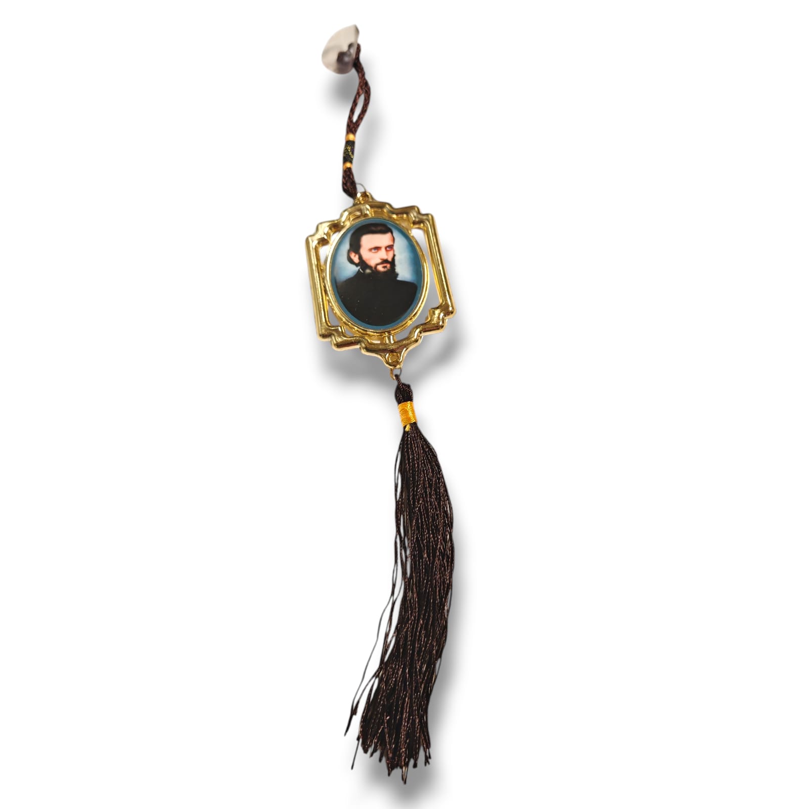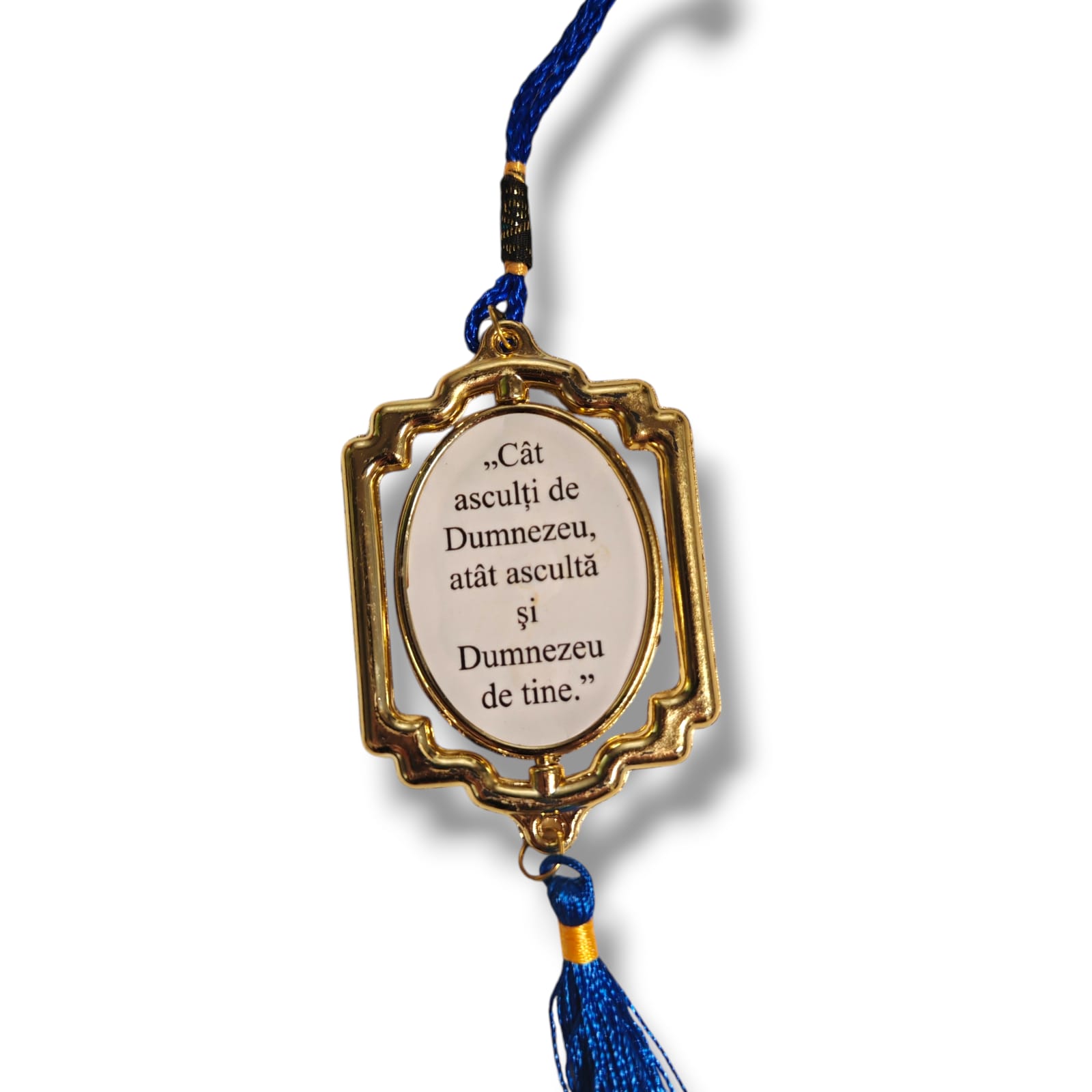 Acest pandantiv auto este un accesoriu elegant și plin de însemnătate, creat pentru a aduce o stare de liniște și protecție în fiecare călătorie. Designul său clasic, cu ramă aurie, se potrivește perfect la oglinda retrovizoare a oricărui autoturism.