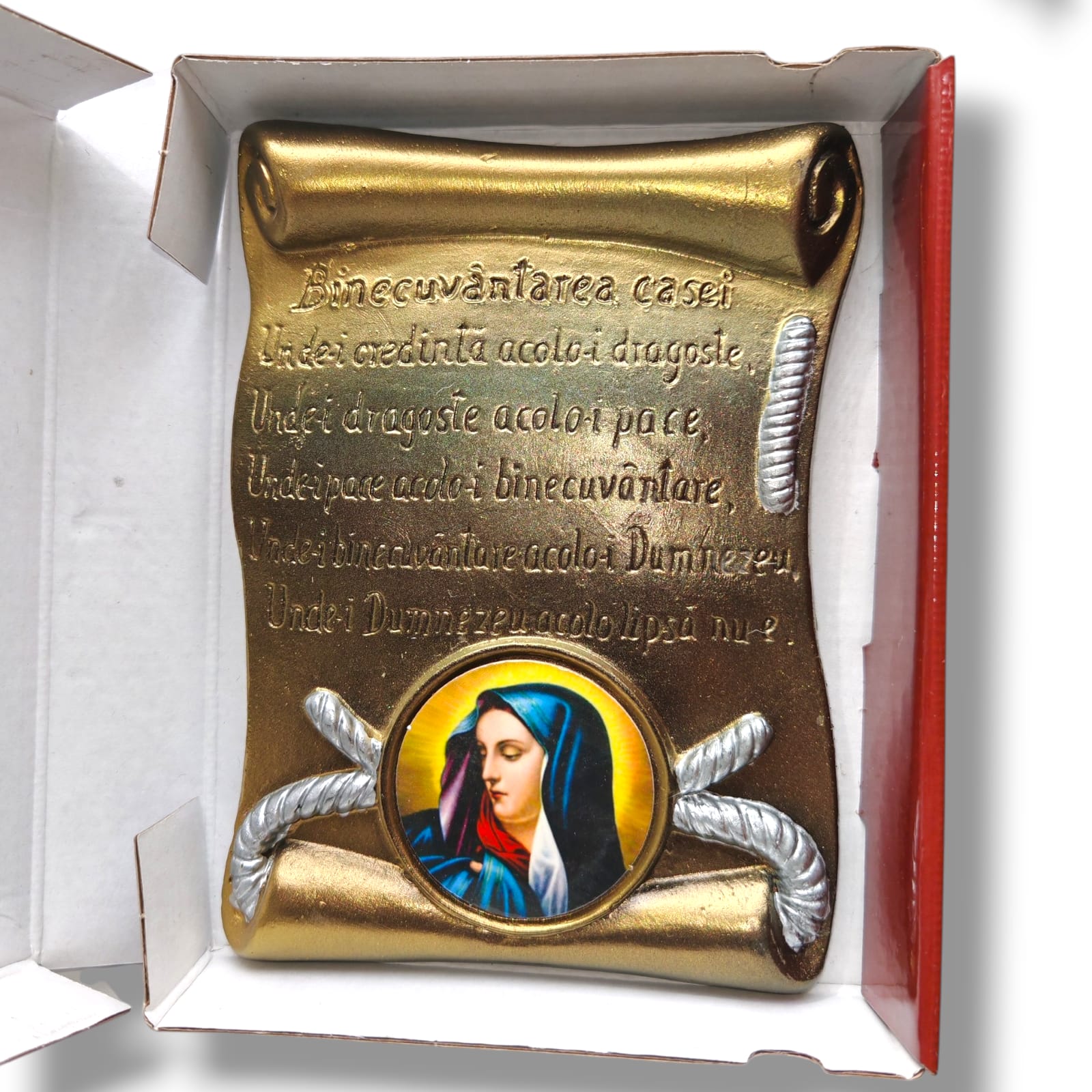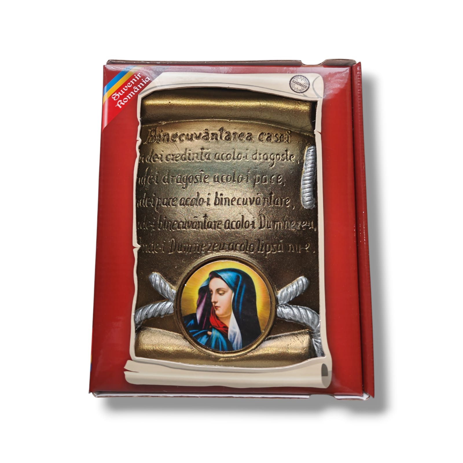 Placheta din ceramica Binecuvantarea Casei Mica cu Maica Domnului vine ambalata in cutie dedicata si poate reprezenta cadoul ideal pentru cei dragi dar in acelasi timp si pentru uz personal.